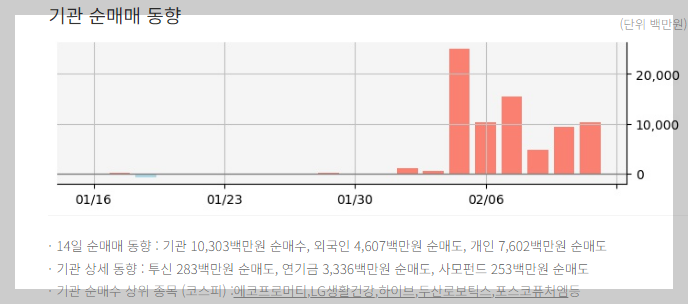 • 14일 순매매 동향 : 기관 10,303백만원 순매수, 외국인 4,607백만원 순매도, 개인 7,602백만원 순매도