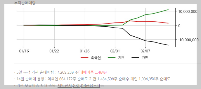• 3일 누적 기관 순매매 : 4,315,608 주 (상장주식수대비 0.87%)