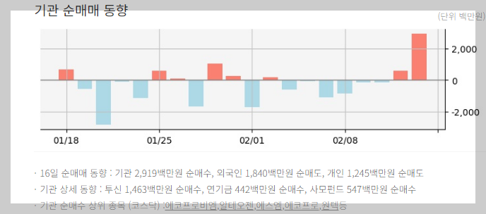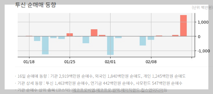 - 2024년 2월 16일 코스닥 투신 전체 순매수 규모는 2,919억원입니다.