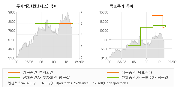 키움증권의 동종목에 대한 최근 3개월 동안의 투자의견은 전체적으로 큰 변화없이 유지되고 있다. 목표주가는 2023년11월 14,000원까지 높아졌다가 2024년1월 11,000원을 최저점으로 목표가가 제시된 이후 최근에도 11,000원으로 제시되고 있다.