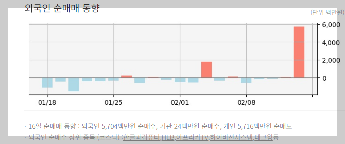 - 2024년 2월 16일 코스닥 외국인 전체 순매수 규모는 5,704억원입니다.