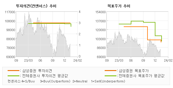 목표주가는 2023년5월 125,000원까지 높아졌다가 2023년10월 100,000원을 최저점으로 목표가가 제시된 이후 최근에 95,000원으로 새롭게 조정되고 있다.