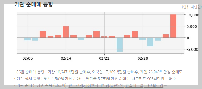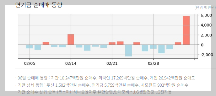 2024년 3월 6일 코스피 연기금 순매수 상위 종목