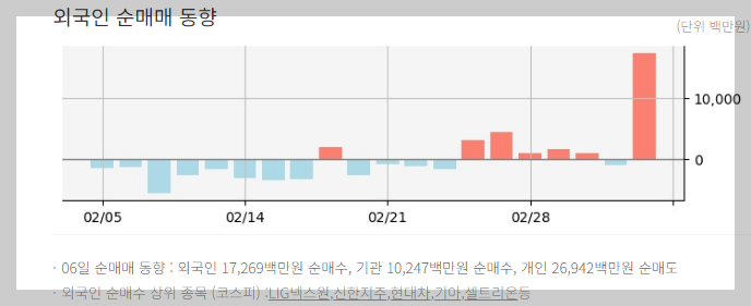 06일 순매매 동향 : 외국인 17,269백만원 순매수, 기관 10,247백만원 순매수, 개인 26,942백만원 순매도